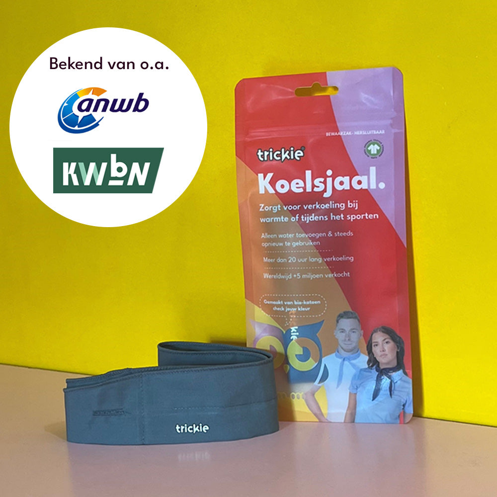 The Trickie® CoolScarf was developed to provide cooling in a simple, natural way. Thanks to its high-quality cooling polymer, the scarf stays fresh, light, and comfortable for extended periods. It has already been sold thousands of times in the Netherlands and Belgium and is popular with organizations such as the ANWB (Royal Dutch Touring Club) and Wandelbond (Hiking Association): a proven product that stands for quality and convenience.