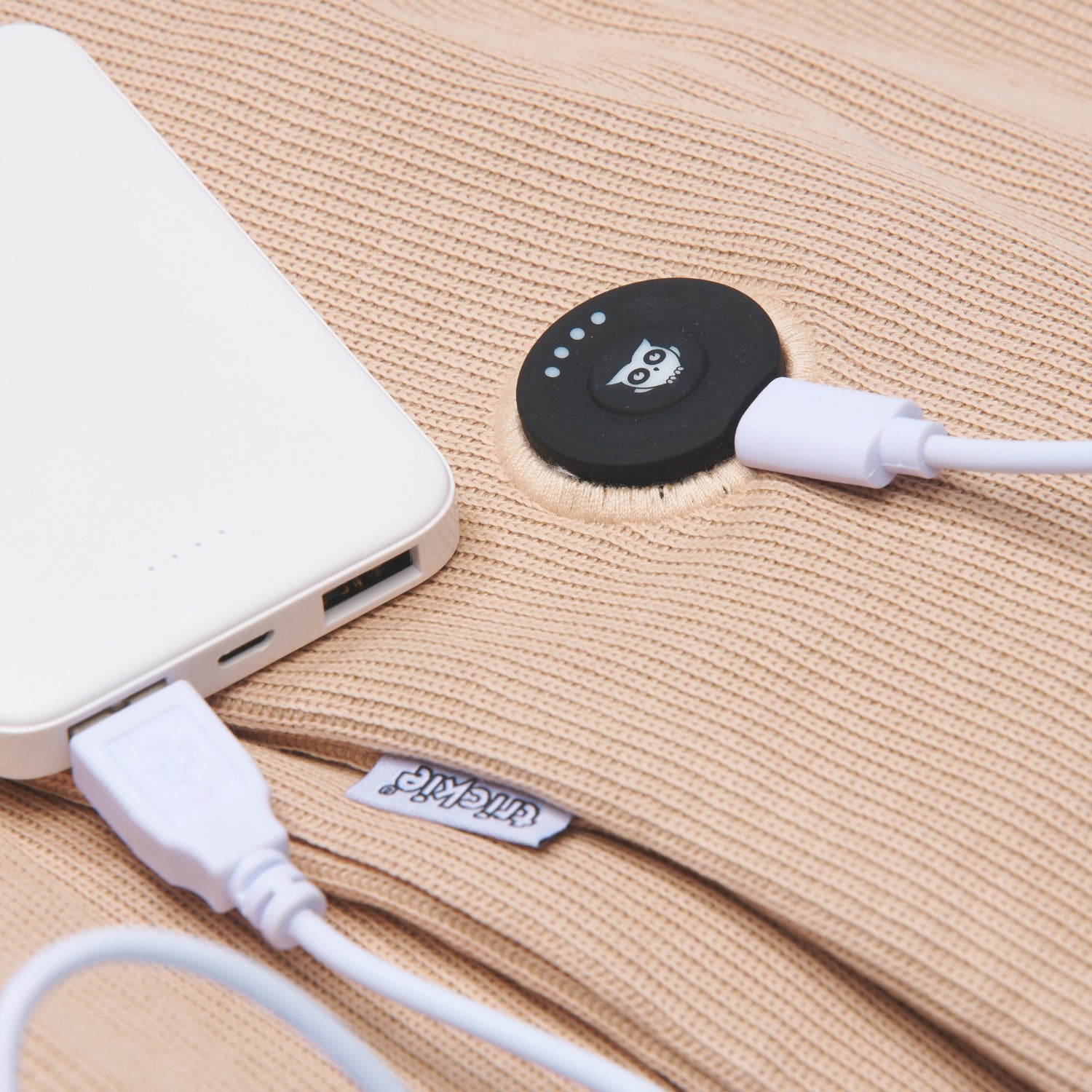 Het oplaadpunt van de PowerScarf bevindt zich onder de bedieningsknop. Via de USB-C ingang kun je de interne accu opladen zonder deze te verwijderen. Gebruik hiervoor de meegeleverde 5V USB-adapter of een powerbank (zoals de Trickie PowerBank). De LED-indicatoren laten zien wanneer het laden bezig is of voltooid is.