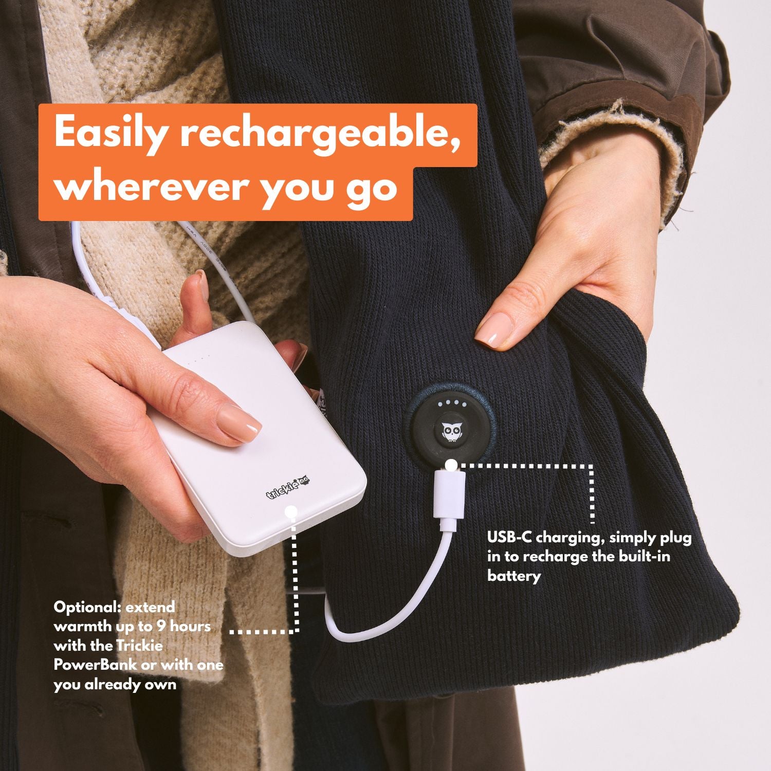 Wil je langer warmte? Geen probleem. Dankzij het slimme ontwerp sluit je de sjaal eenvoudig via USB-C aan op een powerbank die je in je (binnen)zak kunt meenemen. Met de Trickie PowerBank (5.000 mAh) verleng je de gebruiksduur tot ±9 uur, en met grotere powerbanks zelfs nog langer.